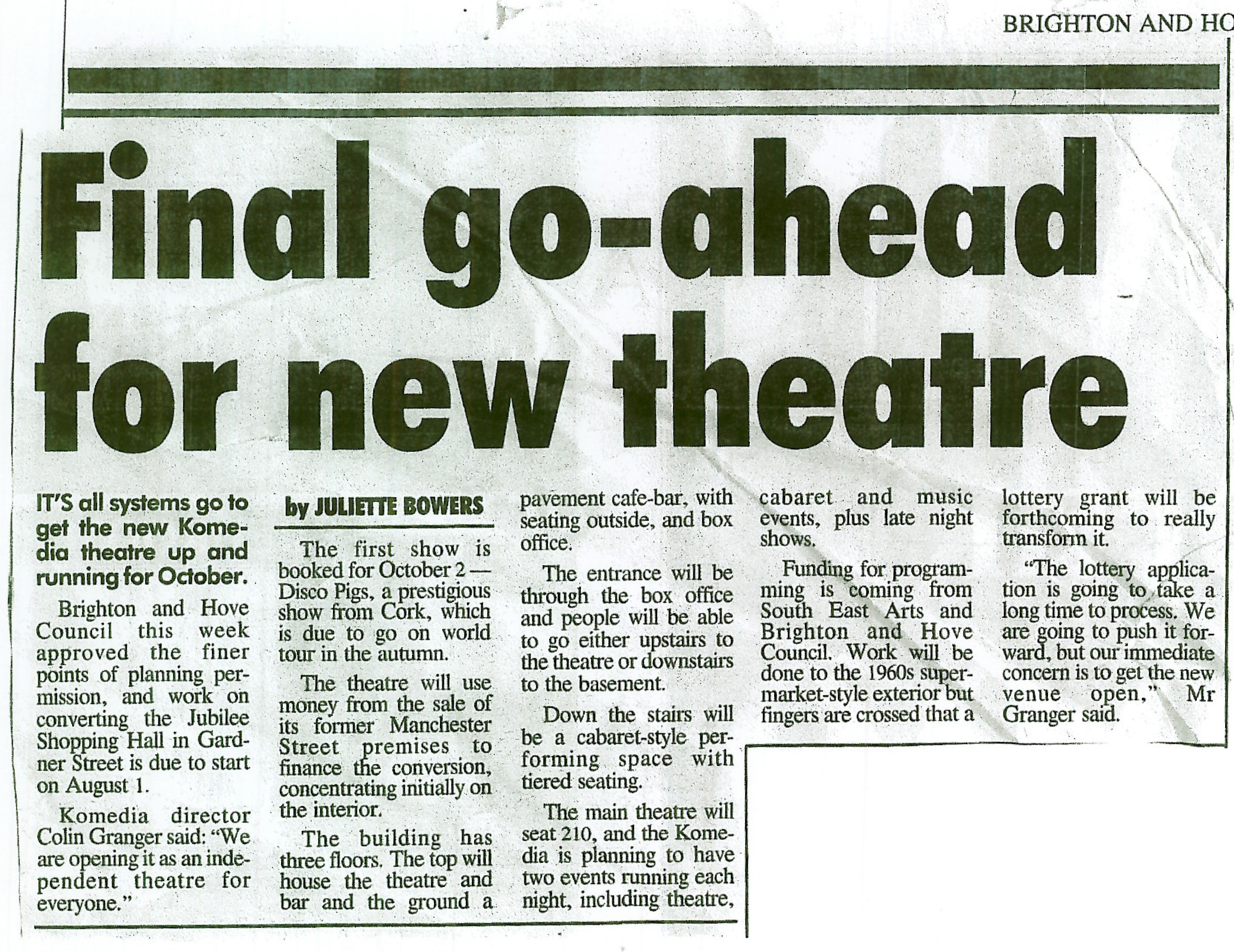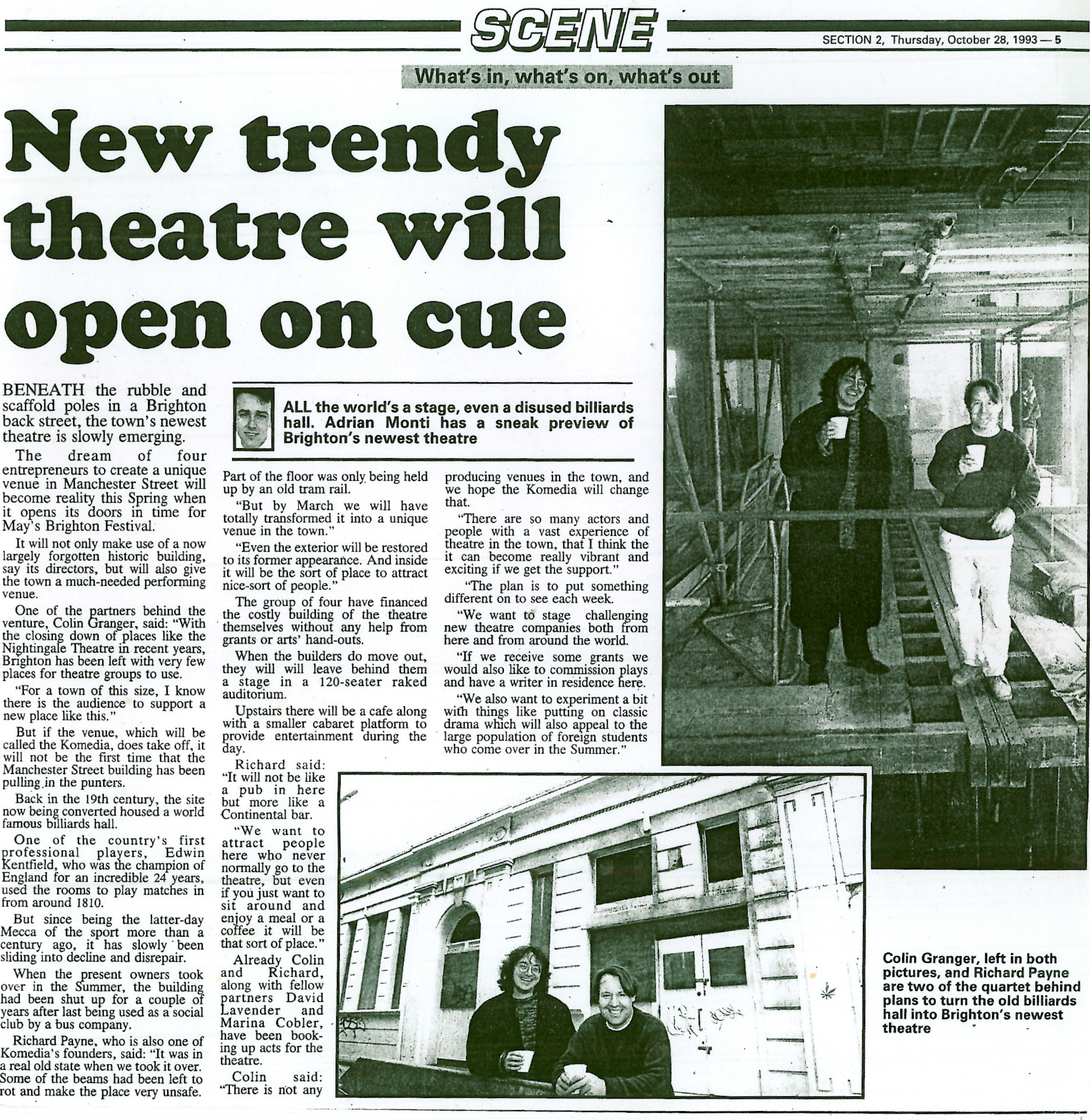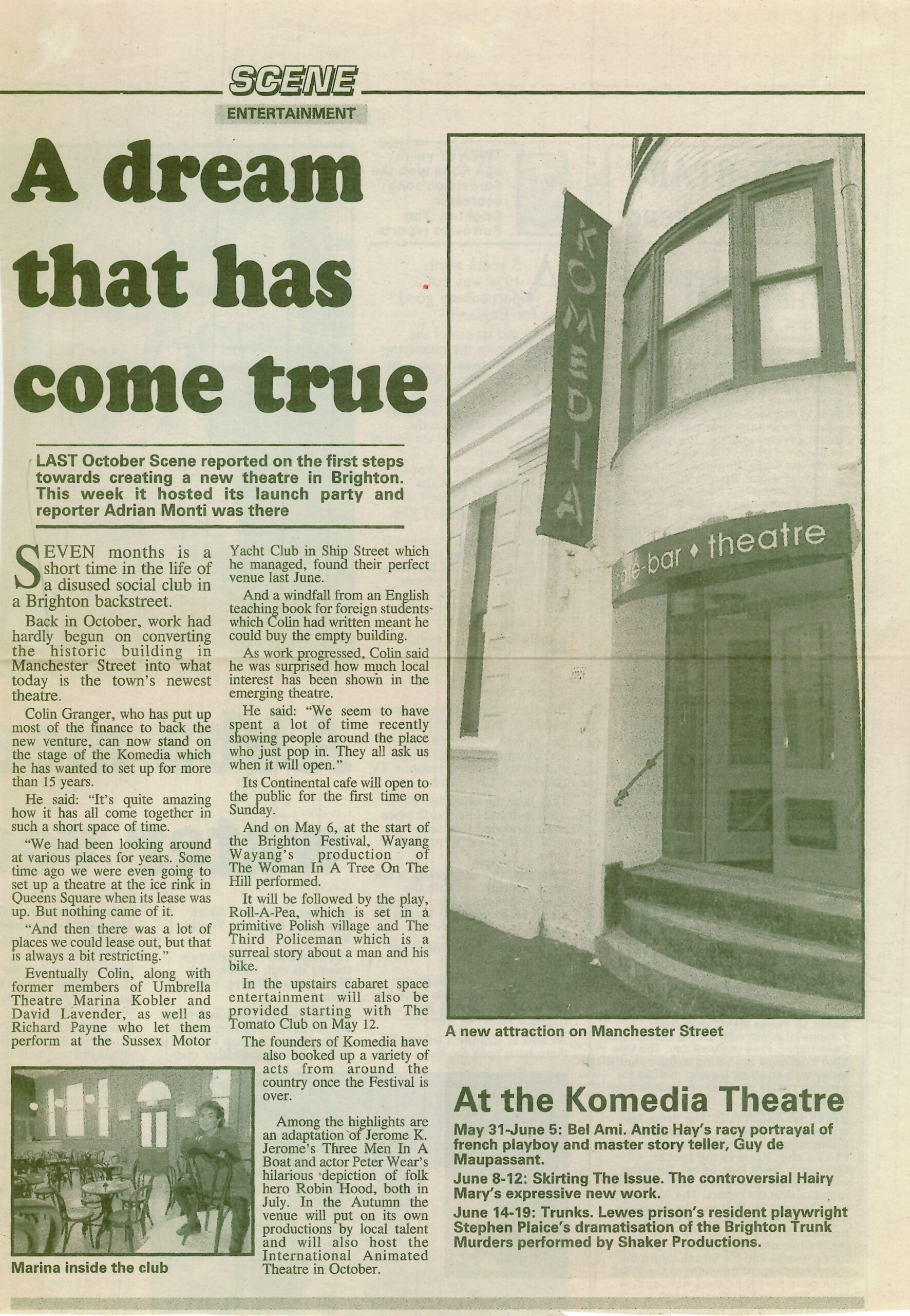 Komedia was born from the minds of the directors of ‘Umbrella Theatre’, Colin Granger, Marina Kobler, and David Lavender. The company modelled the venue on the cabaret theatres they had seen while touring in cities such as Copenhagen, Amsterdam and Berlin. Lavender stumbled across the name Komedia in an international theatre magazine chose it as it had ‘echoes of both comedy and media, and a sense of crossing boundaries.’