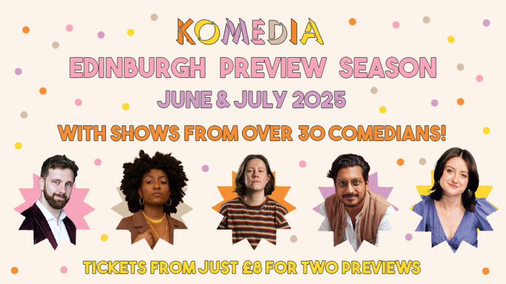 At Komedia, our Edinburgh Preview Season takes places throughout June and July 2025, with work-in-progress shows from more than 30 amazing acts such as Chloe Petts, Pierre Novellie, and Sophie Duker.